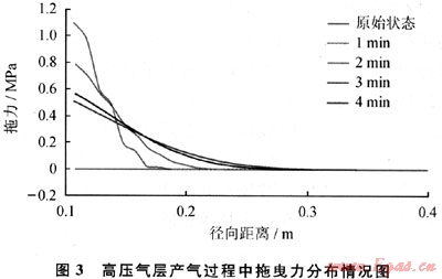 由式(3)可以看出,高壓氣體高速流動(dòng)產(chǎn)生的附加拖曳力與高壓產(chǎn)氣層近井壁地帶孔隙壓力梯度變化相關(guān)。結(jié)合前面得到的高壓氣層產(chǎn)氣過程中孔隙壓力分布情況,便可得到高壓氣層產(chǎn)氣過程中拖曳力變化情況,如圖3所示。