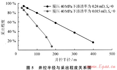 。 采用該方法對(duì)蘇里格氣田單井理論最大采出程度進(jìn)行計(jì)算,其結(jié)果見圖5。對(duì)于蘇里格氣田,其原始地層壓力在25MPa左右,則覆壓40MPa下滲透率為0.12~0.312mD(平均值0.24mD)的不含水儲(chǔ)層在井控泄流半徑400m范圍內(nèi)理論最大采出程度在15%以上,覆壓40MPa下滲透率為0.015mD的不含水儲(chǔ)層在井控泄流半徑200m范圍內(nèi)理論最大采出程度在7%以上。