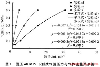 第二步:連接氣源,采用調(diào)壓閥設(shè)置氣驅(qū)壓力從低壓(0.05MPa)開始逐級(jí)增壓(0.1MPa,0.2MPa,0.3MPa,0.4MPa,0.5MPa,0.6MPa,…,5.0MPa)進(jìn)行氣驅(qū),每個(gè)壓力點(diǎn)氣驅(qū)時(shí)間在1.0h以上直至氣流量穩(wěn)定,采用皂沫流量計(jì)或者高精度電子流量計(jì)測(cè)試氣體流量,高精度壓力傳感器記錄壓力。