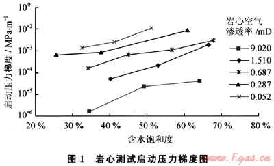 啟動(dòng)壓力梯度定義為作用在流體上的壓差達(dá)到一定程度時(shí),流體克服黏滯力開始流動(dòng)時(shí)的壓力梯度。在低滲透氣藏中,氣體滲流是否存在啟動(dòng)壓力梯度以及啟動(dòng)壓力梯度產(chǎn)生的條件一直是石油工作者研究和爭(zhēng)論的焦點(diǎn)之一。持肯定觀點(diǎn)的學(xué)者認(rèn)為天然氣在高溫高壓條件下與孔隙界面會(huì)產(chǎn)生一定的界面效應(yīng),或因?yàn)榭紫吨兴拇嬖诙率箽怏w滲流存在一定的啟動(dòng)壓力梯度。持否定觀點(diǎn)的研究人員認(rèn)為天然氣分子小,易于流動(dòng),在孔隙介質(zhì)中流動(dòng)不存在啟動(dòng)壓力梯度,如果說(shuō)因?yàn)榭紫吨泻幸欢柡投鹊乃率箽怏w在某些條件下不流動(dòng),應(yīng)歸于兩相滲流的問(wèn)題。筆者認(rèn)為:?jiǎn)?dòng)壓力梯度概念能較好的反映氣體流動(dòng)的動(dòng)態(tài)特征,綜合反應(yīng)了儲(chǔ)層物性、含水及驅(qū)動(dòng)壓力對(duì)氣體滲流的影響,在滲流方程中引入啟動(dòng)壓力梯度,能更好地描述低滲儲(chǔ)層的滲流特征,確定氣井的有效動(dòng)用范圍,為低滲氣藏開發(fā)井距的確定和井網(wǎng)優(yōu)化部署提供依據(jù)。根據(jù)實(shí)驗(yàn)分析,同一物性巖樣,含水飽和度越大,啟動(dòng)壓力梯度越大;巖石物性越差,啟動(dòng)壓力梯度越大,并且受含水飽和度影響更顯著(圖1)。