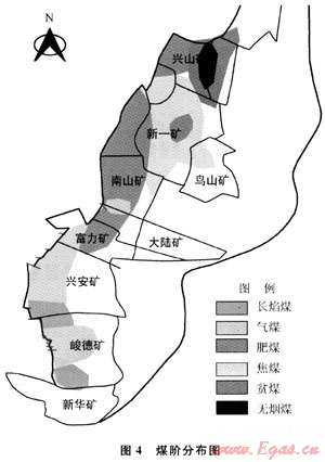 例如峻德、興安礦區(qū)主要為氣煤和長(zhǎng)焰煤,興安北部的富力、大陸、南山礦變?yōu)榉拭海列乱坏V深部、鳥山區(qū)變?yōu)榻姑海傧虮狈植加胸毭汉蜔o(wú)煙煤(圖4)。因此煤變質(zhì)程度較高的南山、新一礦煤層瓦斯含量相應(yīng)增高,使得礦井瓦斯涌出量較大,屬高瓦斯突出礦區(qū)。