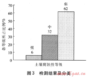 對埋地鋼管沿線的土壤腐蝕性采用等距法檢測,儀器采用ZC-8型土壤電阻率測量儀,共測量99處。其土壤電阻率范圍為15.08~207.37Ω·m,檢測結果及分類見圖3。