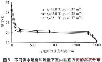在不同供水溫度和流量下,室內(nèi)垂直方向溫度分布見圖5。由圖5可知:①隨著高度的增加,空氣溫度迅速降低,在距地面200mm處溫度基本達到穩(wěn)定,而在距地面1800mm以上溫度迅速降低。②隨著供水流量的增大與供水溫度的升高,各測點溫度也相應(yīng)升高,且在地面附近溫度差異明顯,在頂棚附近溫度沒有明顯變化。這種現(xiàn)象反映r熱管地板輻射采暖與普通地板輻射采暖的特點一致,即室內(nèi)空氣垂直方向溫度梯度小。