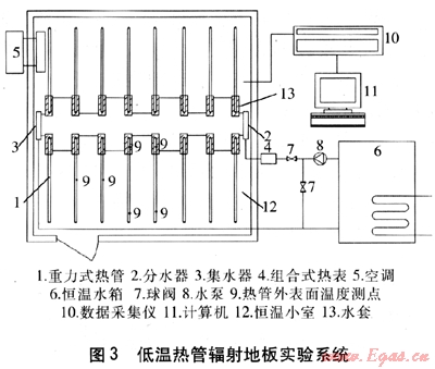 碳鋼/水重力式熱管(又稱碳鋼/水兩相閉式熱虹吸管)具有結(jié)構(gòu)簡單、成本低廉、傳熱性能優(yōu)良、工作可靠等特點,在冶金、化工、建材、動力等行業(yè)有很多成功的應(yīng)用實例[1]。隨著熱管技術(shù)的不斷成熟,其在建筑行業(yè)的應(yīng)用引起了學(xué)者們的關(guān)注。JEBRAIL等制作了熱管散熱器并測試了其熱工性能[2],國內(nèi)學(xué)者蔣愛華等對熱管輻射墻壁進行了探討[3],羅清海等分析了不同工質(zhì)熱管散熱器的熱工性能[4]。本文擬將碳鋼/水重力式熱管與地板輻射采暖系統(tǒng)結(jié)合起來,以期利用其優(yōu)良的傳熱性能,在提供舒適熱環(huán)境的同時,達到降低供水溫度、減小熱水循環(huán)流量、提高系統(tǒng)整體運行效率和經(jīng)濟性的目的。本文在重力式熱管和串聯(lián)熱管傳熱性能研究的基礎(chǔ)上[5],對低溫熱管輻射地板的熱工性能進行實驗研究。