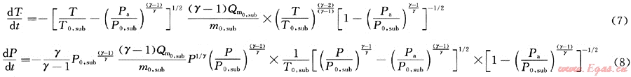據(jù)臨界壓力判別標(biāo)準(zhǔn),并結(jié)合臨界流、亞臨界流變孔徑孔口泄漏下任意時(shí)刻的P、T、ρ、Qm、m的計(jì)算關(guān)系式[1],運(yùn)用格林函數(shù)可得出其溫度和壓力經(jīng)驗(yàn)解析公式如下:
