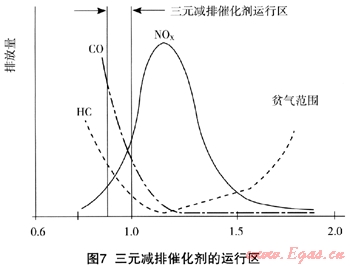 所用的催化劑應(yīng)根據(jù)天然氣的組分變化進行修正。催化劑對高烴含量的作用遠大于甲烷和乙烷。甲烷需要加載更多的催化劑材料,更高的排氣溫度和較低的空間速度(空速)。鈀催化劑常用于甲烷的轉(zhuǎn)換。三元減排催化劑的運行區(qū)可見圖7。