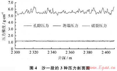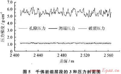 要在九龍山構造安全開展欠平衡鉆井,前提是必須滿足井壁穩(wěn)定條件。測井資料表明,沙一段至珍珠沖組井段多含有泥巖段。因此,有必要采用泥頁巖水化模型分析坍塌壓力剖面。為此,本文利用測井資料,采用加拿大STAB-WELL欠平衡鉆井井壁穩(wěn)定分析軟件對不同層位進行井壁穩(wěn)定計算。圖4是沙一段的3種壓力剖面。從圖4中可以看出,該段破裂壓力高,孔隙壓力梯度為1.254g/cm3,最高坍塌壓力梯度為1.094g/cm3,欠平衡設計的鉆井液密度必須要高于最低坍塌壓力梯度,設計的范圍為1.10~1.25g/cm3。圖5是千佛巖組層段的3種壓力剖面,計算結果表明,該段最高坍塌壓力梯度為1.10g/cm3,欠平衡設計的鉆井液密度必須高于最低坍塌壓力梯度,設計的范圍為1.10~1.25g/cm3。