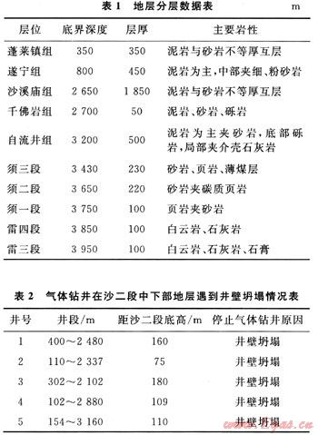 九龍山構造區(qū)域屬于川北坳陷帶中壩、九龍山北東向構造群,米倉山山前帶南部。西北緊鄰龍門山推覆構造帶,北部為米倉山臺緣隆起,東南與川中隆起帶相鄰。地層分層數(shù)據(jù)見表1。地層分層的數(shù)據(jù)表明,在于佛巖組與自流井組存在堅硬的礫巖層,其礫巖成分有石英、燧石和黃鐵礦等,研磨性強,可鉆性極差,將導致機械鉆速急劇降低,以龍17井為例,在千佛巖組2932~3036m井段,進尺共104m,消耗鉆頭11只,平均單只鉆頭進尺僅為9.5m,平均機械鉆速為0.85m/h。多個區(qū)塊的鉆井實踐表明[3~6],與其他鉆井技術相比,氣體鉆井的提速效果異常明顯。因此,九龍山構造開發(fā)前期,在沙溪廟組廣泛開展氣體鉆井技術,但是氣體鉆井雖然機械鉆速加快,但多口井卻出現(xiàn)井壁坍塌,使井況更加復雜(表2),且由氣體鉆井轉換為常規(guī)鉆井后,下部地層的機械鉆速降低明顯。若要在下部地層繼續(xù)安全快速鉆進,液體欠平衡鉆井可作為一種重要手段。