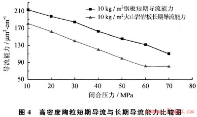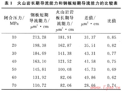 在閉合壓力一定的情況下,火山巖巖板長期導(dǎo)流能力比鋼板短期導(dǎo)流能力低28.66~49.86ftm2·cm,火山巖巖板長期導(dǎo)流能力和鋼板短期導(dǎo)流能力之比值為0.62~0.85。不同閉合壓力下的兩者的比值也不一樣(表1)。因此為了得到準(zhǔn)確的長期導(dǎo)流能力巖板的長期導(dǎo)流能力實驗是必要的。以往的國內(nèi)壓裂設(shè)計在沒有長期導(dǎo)流能力實驗系統(tǒng)的情況下,有經(jīng)驗的壓裂設(shè)計人員經(jīng)常取短期值的1/3作為計算機程序設(shè)計軟件的輸入數(shù)據(jù),以此來降低因?qū)Я髂芰Σ钪翟斐傻挠嬎憬Y(jié)果的誤差。