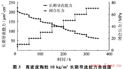 長期導(dǎo)流能力的實驗條件均考慮了地層溫度、地層鹽水的影響,為了實際考察支撐劑嵌入地層的影響,使用了火山巖巖板。實驗連續(xù)運轉(zhuǎn),實驗時間超過300h。