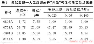 “并聯(lián)”傳質(zhì)實驗中,裂縫寬度是影響致密砂巖天然氣傳質(zhì)的關鍵參數(shù),裂縫寬度越大其傳質(zhì)效率越高。在天然裂縫-人工裂縫并聯(lián)傳質(zhì)實驗中,裂縫寬度相近的兩類裂縫,人工裂縫傳質(zhì)效率低于天然裂縫。分析認為,由于人工裂縫縫面屬于新鮮斷面,有較多的可動微粒,隨著驅(qū)替壓差的增加,氣體流速增大,參與運移的微粒增多,部分微粒在縫面狹窄處沉積、堵塞,使得裂縫滲流能力大幅降低;另外實驗過程是采取的連續(xù)變驅(qū)替壓力,圍壓不變的方式,在長時間的圍壓(3MPa)條件下,由于有效應力的時間效應[8],無支撐的人工裂縫寬度相應降低,而天然裂縫經(jīng)過漫長的地質(zhì)演化,天然縫縫面間有膠結(jié)物、顆粒支撐,抗應力敏感能力強于天然縫,裂縫寬度變化相應較小,其滲流能力降低幅度小。