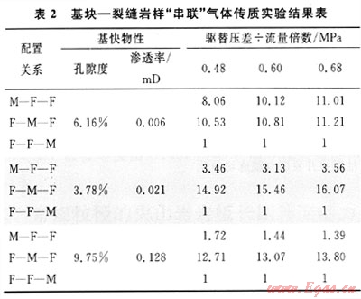 基塊物性不變,變換裂縫-基塊配置關系,對比各個配置關系傳質(zhì)效率,表2實驗結(jié)果表明:F-F-M配置關系傳質(zhì)效率最低,以F-M-F配置關系傳質(zhì)效率最優(yōu)。實驗數(shù)據(jù)統(tǒng)計表明:F-M-F配置傳質(zhì)效率是F-F-M配置的10~16倍,M-F-F配置傳質(zhì)效率是F-F-M配置的1~13倍。