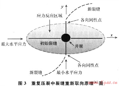 重復(fù)壓裂是指當(dāng)頁(yè)巖氣井初始?jí)毫烟幚硪呀?jīng)無(wú)效或現(xiàn)有的支撐劑因時(shí)間關(guān)系損壞或質(zhì)量下降,導(dǎo)致氣體產(chǎn)量大幅下降時(shí),采用壓裂工藝對(duì)氣井經(jīng)行重新壓裂增產(chǎn)的工藝。頁(yè)巖氣井初始?jí)毫押?,?jīng)過(guò)一段時(shí)間的生產(chǎn),井眼周?chē)膽?yīng)力會(huì)發(fā)生變化,重復(fù)壓裂能夠重新壓裂裂縫或使裂縫重新取向,使頁(yè)巖氣井產(chǎn)能恢復(fù)到初始狀態(tài)甚至更高(圖3)。美國(guó)Barnett頁(yè)巖在1995年前廣泛使用凝膠壓裂,1997年開(kāi)始發(fā)展清水壓裂,作業(yè)者對(duì)先前使用凍膠壓裂增產(chǎn)產(chǎn)量下降的井使用清水壓裂重新改造,改進(jìn)處理液回收工作流程,氣井產(chǎn)量明顯提高,部分井產(chǎn)量甚至超過(guò)了初次壓裂時(shí)的產(chǎn)量[5]。