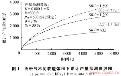 頁巖氣儲層滲透率超低,厚度大,天然裂縫發(fā)育,氣體主要以吸附態(tài)吸附在有機(jī)質(zhì)表面,常規(guī)改造形成單一裂縫很難獲得好的增產(chǎn)效果。數(shù)值模擬研究表明[3],頁巖氣儲層改造的體積(SRV,106ft3;1ft3=0.028317m3,下同)越大,壓后增產(chǎn)效果越好(圖1)。但要實(shí)現(xiàn)體積改造,除地層要具備體積壓裂的基本條件外,壓裂改造工藝方法也十分關(guān)鍵。