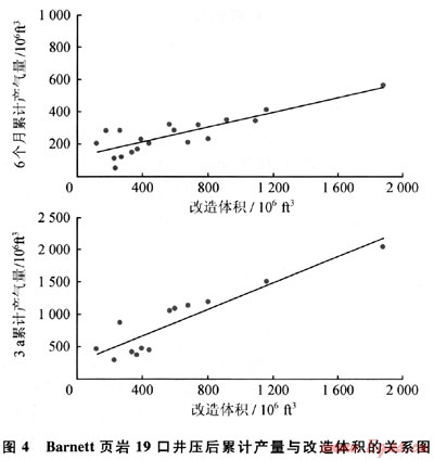 在Barnett頁巖19口有井下微地震監(jiān)測資料的井,改造后的體積與壓后6個(gè)月和3a累計(jì)產(chǎn)量的比較曲線見圖4。由圖4可見:19口井的壓裂改造體積在5.3×106~52.7×106m3,且壓后4個(gè)月的累計(jì)產(chǎn)量隨著改造體積的增加而增加,壓后3a增加的幅度更大,這充分說明改造體積對頁巖氣壓后產(chǎn)量的重要作用。