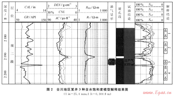 圖2第9道Sw1、Sw2、Sw3是用3種含水飽和度模型和相同的處理參數(shù)對合川某井計算的含水飽和度結(jié)果,3者差異較大,其準(zhǔn)確性需要加以分析和檢驗。合川地區(qū)沒有油基鉆井液取心資料和密閉取心資料,水基鉆井液取心巖樣的含水飽和度在70%以上,與實際相差甚大。核磁測井能夠提供可靠的儲層含水飽和度參數(shù)[6~8],且不受巖性的影響。因此,利用核磁測井資料檢驗所求含水飽和度的準(zhǔn)確性。