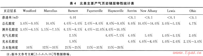 頁巖氣儲層具低孔、特低滲致密的物性特征。美國主要產(chǎn)氣頁巖儲層巖心分析總孔隙度分布在2.0%~14.00%,平均為4.22%~6.51%;測井孔隙度分布在4.0%~12.00%,平均為5.2%;充氣孔隙度分布在1.0%~7.5%,充水孔隙度為1.0%~8.0%(表4)。滲透率一般小于0.1mD,平均喉道半徑不到0.005μm[2]。