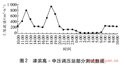 這就需要我們根據(jù)不同季節(jié)、不同時段管網(wǎng)負(fù)荷的峰谷情況,調(diào)整供氣工況。例如對河?xùn)|區(qū)域供氣的衛(wèi)國道高-中壓調(diào)壓站、津濱高-中壓調(diào)壓站、張貴莊高-中壓調(diào)壓站,我們通過適當(dāng)調(diào)低衛(wèi)國道高-中壓調(diào)壓站、津濱高-中壓調(diào)壓站調(diào)壓器出口壓力、關(guān)閉壓力,即衛(wèi)國道高-中壓調(diào)壓站、津濱高-中壓調(diào)壓站調(diào)壓器出口壓力為0.095MPa,關(guān)閉壓力為0.12MPa,張貴莊高-中壓調(diào)壓站調(diào)壓器出口壓力為0.11MPa,關(guān)閉壓力為0.14MPa。通過調(diào)整調(diào)壓器參數(shù)來實現(xiàn)高-中壓調(diào)壓站間大小流量自動切換,即用氣低峰時僅張貴莊高-中壓調(diào)壓站給河?xùn)|區(qū)域供氣,用氣高峰時,衛(wèi)國道高-中壓調(diào)壓站、津濱高中壓調(diào)壓站、張貴莊高-中壓調(diào)壓站同時供氣,這樣可以有效避免高-中壓調(diào)壓站流量計每天小流量數(shù)據(jù)丟失問題。對給河北區(qū)供氣的金鐘高-中壓調(diào)壓站,我們采用一臺大調(diào)壓器及一臺小調(diào)壓器并聯(lián)運(yùn)行,適當(dāng)調(diào)低大調(diào)壓器出口壓力、關(guān)閉壓力,即大調(diào)壓器出口壓力為0.095MPa,關(guān)閉壓力為0.12MPa,小調(diào)壓器出口壓力為0.12MPa,關(guān)閉壓力0.15MPa,這樣用氣低峰時僅小調(diào)壓器供氣,用氣高峰時,大、小兩組調(diào)壓器同時供氣,這樣提高計量精度,并且避免由于僅大調(diào)壓器供氣造成調(diào)壓器頻繁開啟關(guān)閉產(chǎn)生氣體脈動流導(dǎo)致的計量誤差。