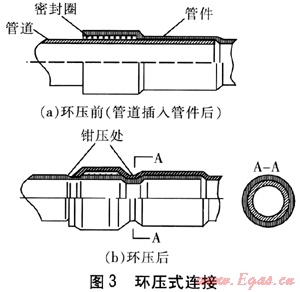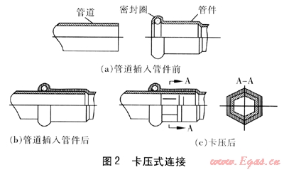 卡壓式連接是將“0”型密封圈,用專(zhuān)用卡壓工具壓入連接處,鉗壓后斷面呈六邊形的一種擠壓式連接方式。其優(yōu)點(diǎn)是操作方便,易于安裝;缺點(diǎn)是連接強(qiáng)度不夠高,抗外力能力差??▔菏竭B接見(jiàn)圖2。