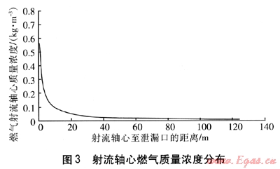 編程計(jì)算的燃?xì)馍淞鬏S心質(zhì)量濃度分布見圖3。當(dāng)射流軸心至泄漏口的距離約為9.9m時(shí),含量達(dá)到爆炸上限(15%),當(dāng)射流軸心至泄漏口的距離約為30.6m時(shí),含量低于爆炸下限(5%)。當(dāng)射流軸心至泄漏口的距離為154m時(shí),含量低于燃?xì)獾木潴w積分?jǐn)?shù)(1%)。