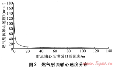編程繪制的燃?xì)馍淞鬏S心速度分布見圖2。由圖2可知,燃?xì)馍淞鬏S心速度迅速衰減,當(dāng)距離泄漏口約125m時(shí),射流軸心速度降至1m/s(靜止空氣中),可視為射流結(jié)束。