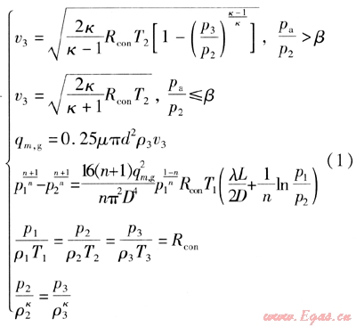 假設(shè)燃?xì)鈴狞c(diǎn)1流至點(diǎn)2為管內(nèi)多變流動(dòng)過程,從點(diǎn)2泄漏到點(diǎn)3為等熵流動(dòng)過程,推導(dǎo)得到點(diǎn)3處燃?xì)獾臏囟?、壓力、流速、密度和質(zhì)量流量[2],見式(1)。
