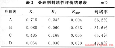 實驗中采用代號為A、B、C、D的4種處理劑,在3.5MPa循環(huán)壓力下對取自井下同一深度的巖心進行了封堵效果測試,結(jié)果見表2。