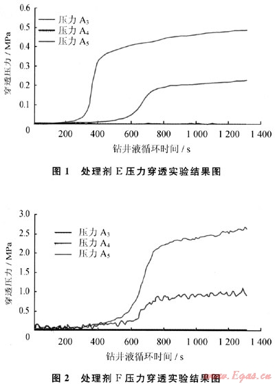 實驗采用處理劑E、F對同一深度的井下巖心進行了壓力穿透測試,結(jié)果見圖1、2。