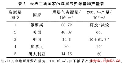 世界主要國(guó)家煤層氣資源量和產(chǎn)量情況如表2所示。