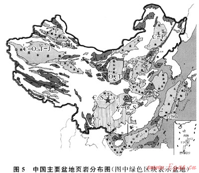 頁(yè)巖氣資源廣泛分布于海相(主要)、陸相沉積盆地內(nèi),在全國(guó)范圍內(nèi),各地質(zhì)歷史時(shí)期都存在頁(yè)巖氣資源。中國(guó)主要盆地頁(yè)巖分布如圖5所示。