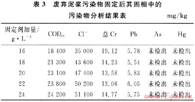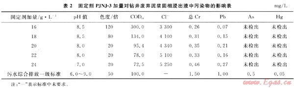 表2數(shù)據(jù)表明:隨著固定劑PJNJ-3的加入,廢棄泥漿分離出的固相物浸出液中主要污染物COD和色度在降低,總Cr和Pb的濃度略有增加,但不明顯,當(dāng)加量達到20g/L以上時,浸出液中各項污染物指標均能滿足污水綜合排放一級標準要求。