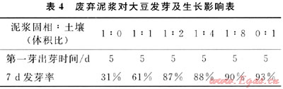 從表4可以看出:廢棄泥漿處理后的固相物對大豆發(fā)芽有著明顯的不利影響,可能主要是其中有較高濃度的Cl-所致;隨著摻入土壤量的增加,大豆發(fā)芽率明顯提高,當(dāng)土壤量增大到泥漿固相物的2倍以后,大豆發(fā)芽基本沒有影響。說明只要摻入量合適,廢棄泥漿固相物是可以用作土壤的。