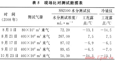 從表2可以清楚看出,激光水分測(cè)試儀能及時(shí)反映出天然氣水分含量的變化情況。在每天4次的記錄中,可以看到,在氣溫最高的16:O0天然氣的水分含量是最高的,這是和實(shí)際情況相吻合。由于“白晝”效應(yīng),在氣溫高的時(shí)候,吸附在管道管壁上的水分子受到陽(yáng)光能量的影響,導(dǎo)致水分子運(yùn)動(dòng)加劇,造成管壁上水分的分壓增加,使得水分子從管壁進(jìn)入到管道中,使得水分含量增加;隨著氣溫的降低,水分子又被吸附到管壁使得水分含量降低。