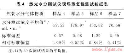 在A、B輸氣點(diǎn)站安裝SS2000激光水分測(cè)試儀,運(yùn)行6個(gè)月后,采用中國(guó)測(cè)試技術(shù)研究院制備的4瓶瓶裝水分氣體物質(zhì)(補(bǔ)充氣分別為氮?dú)夂图淄?,對(duì)儀器的重復(fù)性進(jìn)行了考察。實(shí)驗(yàn)結(jié)果見表4。