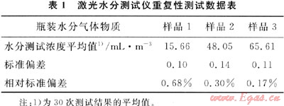 重復(fù)性是儀器的重要技術(shù)指標(biāo),直接影響分析結(jié)果的不確定度。在實(shí)驗(yàn)室對(duì)儀器的重復(fù)性進(jìn)行了考察。測(cè)試對(duì)象為中國(guó)測(cè)試技術(shù)研究院制備的3瓶瓶裝水分氣體物質(zhì)(補(bǔ)充氣為氮?dú)?,用SS2000激光水分測(cè)試儀對(duì)每瓶氣體進(jìn)行了連續(xù)1h的測(cè)試,測(cè)試結(jié)果見表1。