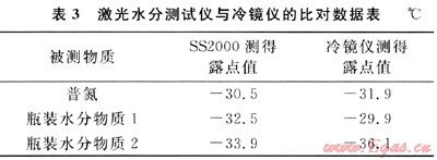 天然氣水分測(cè)試常用的測(cè)試技術(shù)有冷鏡法、電解法、Al2O3電容法和石英晶體法等[5]。在實(shí)驗(yàn)室對(duì)SS2000激光水分測(cè)試法與冷鏡法進(jìn)行了比對(duì)(冷鏡儀由中國(guó)測(cè)試技術(shù)研究院進(jìn)行檢定),被測(cè)物質(zhì)分別為普氮和瓶裝水分物質(zhì)(補(bǔ)充氣為甲烷),濃度值與露點(diǎn)值之間的轉(zhuǎn)換采用ASTM1142標(biāo)準(zhǔn),比對(duì)結(jié)果見表3。