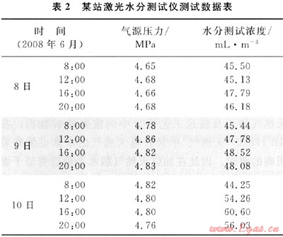 SS2 000激光水分測(cè)試儀在某輸氣站運(yùn)行了4個(gè)月,對(duì)站場(chǎng)進(jìn)氣進(jìn)行實(shí)時(shí)監(jiān)測(cè),于每天8:00、12:O0、16:00和20:O0分別記錄儀器的測(cè)試數(shù)據(jù),2008年6月8~10日的測(cè)試結(jié)果見表2。