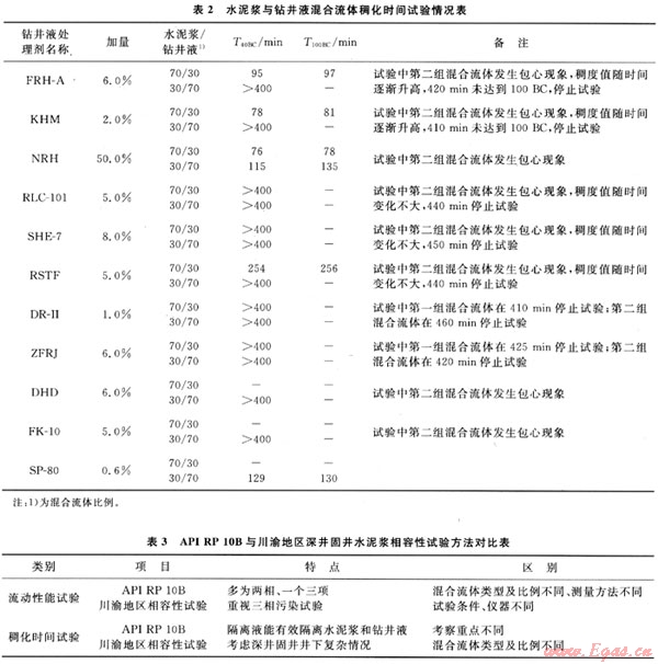 深井一般井深較大,井底溫度、壓力高,小間隙,封固段長,地層復(fù)雜、不穩(wěn)定,地層流體顯示活躍,井徑不規(guī)則,同一裸眼井段存在多個壓力層系,壓力安全窗口小,容易發(fā)生井漏、井涌、氣竄,這就大大增加了深井固井水泥漿防污染技術(shù)的難度。有時為了解決水泥漿與鉆井液的相容性問題,需要反復(fù)調(diào)節(jié)水泥漿配方、調(diào)整鉆井液性能,既延長了固井施工周期,又無法確保施工安全(如LG001-3井Φ127mm尾管插“旗桿”),事倍功半。因此,有必要開展水泥漿防污染技術(shù)研究,找出因鉆井液與水泥漿不相容導(dǎo)致其混合流體稠化時間試驗難以達(dá)標(biāo)的具體原因,并提出針對性的解決辦法,確保固井施工作業(yè)安全,同時提高固井質(zhì)量[1~2]。