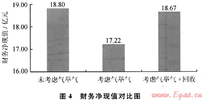 經(jīng)濟(jì)指標(biāo)為財(cái)務(wù)內(nèi)部收益率,財(cái)務(wù)凈現(xiàn)值,靜態(tài)投資回收期,動態(tài)投資回收期,投資利潤率和投資利稅率[6]。根據(jù)經(jīng)濟(jì)指標(biāo)得出:3種情況的財(cái)務(wù)內(nèi)部收益率均大于30%,大于石油財(cái)政基準(zhǔn)收益率12%;若增添壓縮機(jī),則投資成本能夠在1a內(nèi)收回;靜態(tài)和動態(tài)投資回收期均小于1a。如圖4,添加壓縮機(jī)回收低壓氣比目前壓縮機(jī)生產(chǎn)的財(cái)務(wù)凈現(xiàn)值能多獲得1.45億元。