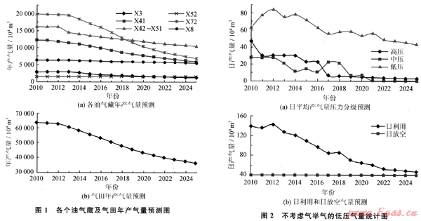 2) 不考慮氣舉氣時(shí),目前的壓縮機(jī)能夠滿足氣田低壓氣回收的要求,2010~2025年可回收低壓氣為35.92×108m3;考慮氣舉氣時(shí),需在2010~2016年增添壓縮機(jī),若添置壓縮能力為20×104m3/d的壓縮機(jī),則2011年、2012年和2014年需要2臺,其他時(shí)間只需1臺,預(yù)計(jì)可回收低壓氣47.26×108m3。