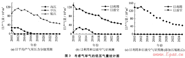 出于經(jīng)濟(jì)考慮,日產(chǎn)氣量低于1×104m3的低壓氣不考慮回收,如果統(tǒng)一添加壓縮能力為20×104m3/d的壓縮機(jī),那么添置情況為2010年1臺,2011年和2012年2臺,2013年1臺,2014年2臺,2015年和2016年1臺。添加壓縮機(jī)之后,日利用和日放空氣量預(yù)測情況如圖3-c,預(yù)計(jì)到2025年累計(jì)可回收低壓氣為47.26×108m3,比放空方案多回收4.79×104m3。