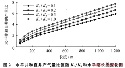 根據(jù)現(xiàn)代油藏工程計(jì)算,某凝析氣藏水平井和直井采氣量比值隨Kv/Kh值和水平段長(zhǎng)度的變化而變化(圖2)。當(dāng)Kv/Kh值為0.2、0.5和水平段長(zhǎng)度為500m的條件下,水平井和直井產(chǎn)氣量比值分別為3.6和4.2。由此可見滲透率非均質(zhì)影響水平井的增產(chǎn)效果。