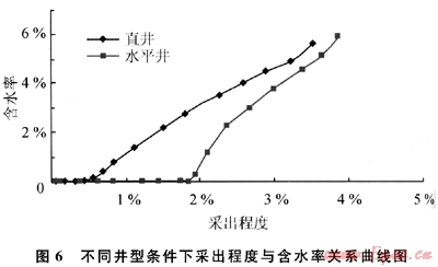對(duì)于同一個(gè)邊底水油藏,采用不同的井型邊底水推進(jìn)的速度是不一樣的。對(duì)于強(qiáng)底水情況,模擬了圓形地層中心1口直井或1口水平井的開采情況,其采出程度與含水率關(guān)系曲線見圖6。從圖中可以看出,水平井的無水開采期比直井的無水開采期長(zhǎng)得多,水平井的采出程度也比直井高。因此同等情況下,水平井的開發(fā)效果要好于直井的開發(fā)效果。