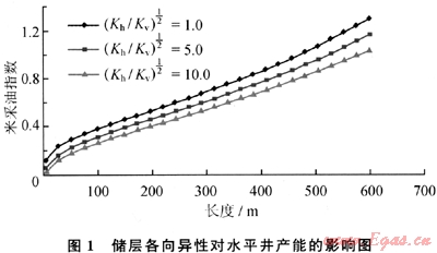 通過對(duì)水平井?dāng)M三維產(chǎn)能方程進(jìn)行離散得出了不同各向異性系數(shù)(水平滲透率與垂向滲透率比值的開方)下,水平井長(zhǎng)度和米采油指數(shù)的關(guān)系。