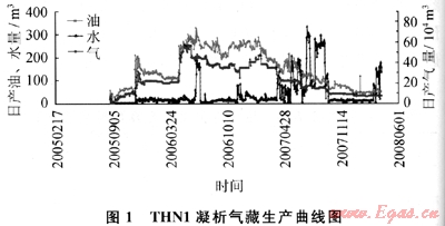 曾經(jīng)計(jì)算了THN1凝析氣藏油氣水三相相滲曲線,結(jié)果表明,油水、氣水有效流動(dòng)范圍較窄,氣井見水后,氣相滲透率急劇降低。當(dāng)油相飽和度大于臨界流動(dòng)飽和度以后,油氣水三相都能流動(dòng)時(shí),氣相與油相的滲流能力都極低,故對(duì)水淹氣井進(jìn)行排液采氣作業(yè)時(shí),氣井排液效果不好,排出的主要是水,基本上不見氣和油。