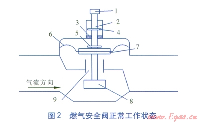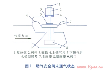 如圖l所示,此型號(hào)燃?xì)獍踩y在未通氣狀態(tài)下,閥瓣在重力作用下下落,磁鐵3吸附上鎖氣片4,主閥瓣7關(guān)閉閥口9,燃?xì)獍踩y處于切斷狀態(tài)。當(dāng)燃?xì)獍踩y通氣后,若不上提復(fù)位鈕進(jìn)行手動(dòng)復(fù)位,燃?xì)獍踩y進(jìn)睜壓力無法克服磁鐵3吸附上鎖氣片4的磁力作用,燃?xì)獍踩y將一直處于如圖l所示的切斷狀態(tài)。