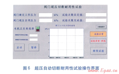 每一個(gè)耐用性試驗(yàn)均存在其獨(dú)立的操作界面,并將全部界面顯示于一個(gè)綜合界面上,界面的切換采用彈出窗口的方式。燃?xì)獍踩y的超壓自動(dòng)切斷耐用性試驗(yàn)的操作界面見圖6。
