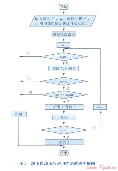 超壓自動(dòng)切斷耐用性自動(dòng)測(cè)試程序框圖見圖5,其中P1為圖4中壓力變送器7反饋至PLC的壓力值,P2為圖4中壓力變送器9反饋至PLC的壓力值。