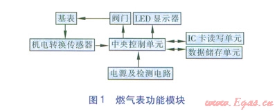 我公司研發(fā)的燃?xì)獗砉δ苣K組成見(jiàn)圖1。中央控制單元是該燃?xì)獗淼暮诵?。通過(guò)Ic卡讀寫單元,使用異常流量參數(shù)IC設(shè)置卡或無(wú)線形式將燃?xì)猱惓A髁繀?shù)傳入燃?xì)獗淼闹醒肟刂茊卧?,通過(guò)中央控制單元保存到數(shù)據(jù)儲(chǔ)存單元中,作為異常流量的判斷依據(jù)。當(dāng)前的瞬時(shí)流量數(shù)據(jù)從基表通過(guò)機(jī)電轉(zhuǎn)換傳感器讀入到中央控制單元后,由中央控制單元計(jì)算出當(dāng)前表內(nèi)的瞬時(shí)流量值并與數(shù)據(jù)儲(chǔ)存單元中的異常流量參數(shù)范圍進(jìn)行比較。當(dāng)確認(rèn)流量異常時(shí),中央控制單元發(fā)出關(guān)閥操作信號(hào)給閥門,閥門關(guān)閉,同時(shí)向顯示器輸出異常流量信號(hào),顯示器顯示異常提示[1]。