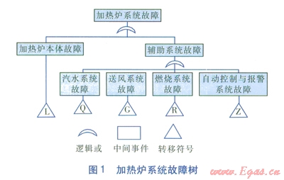 根據(jù)相變加熱爐(以下簡(jiǎn)稱加熱爐)系統(tǒng)的結(jié)構(gòu)和功能的層次分解模型[1-3],采用故障樹(shù)分析法,分析加熱爐系統(tǒng)出現(xiàn)的故障表現(xiàn)與故障原因的邏輯關(guān)系,建立加熱爐系統(tǒng)故障樹(shù)(見(jiàn)圖l)。